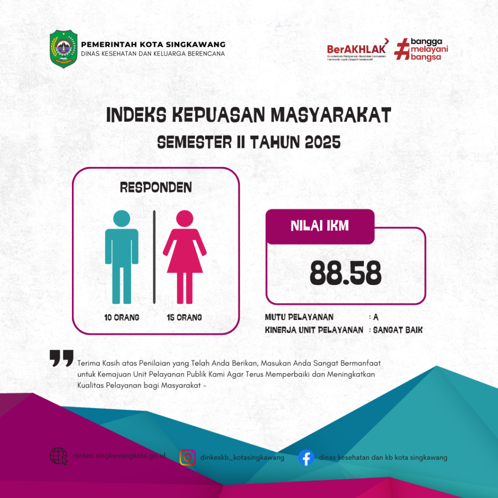 Hasil Survey Survey Kepuasan Masyarakat terhadap Pelayanan Dinas Kesehatan dan Keluarga Berencana Kota Singkawang IKM Semester I 2024 87.77(B) BAIK IKM Semester II 2024 88.11 (B) BAIK IKM Semester I 2025 88.47 (A) SANGAT BAIK IKM Semester II 2025 88.58 (A) SANGAT BAIK